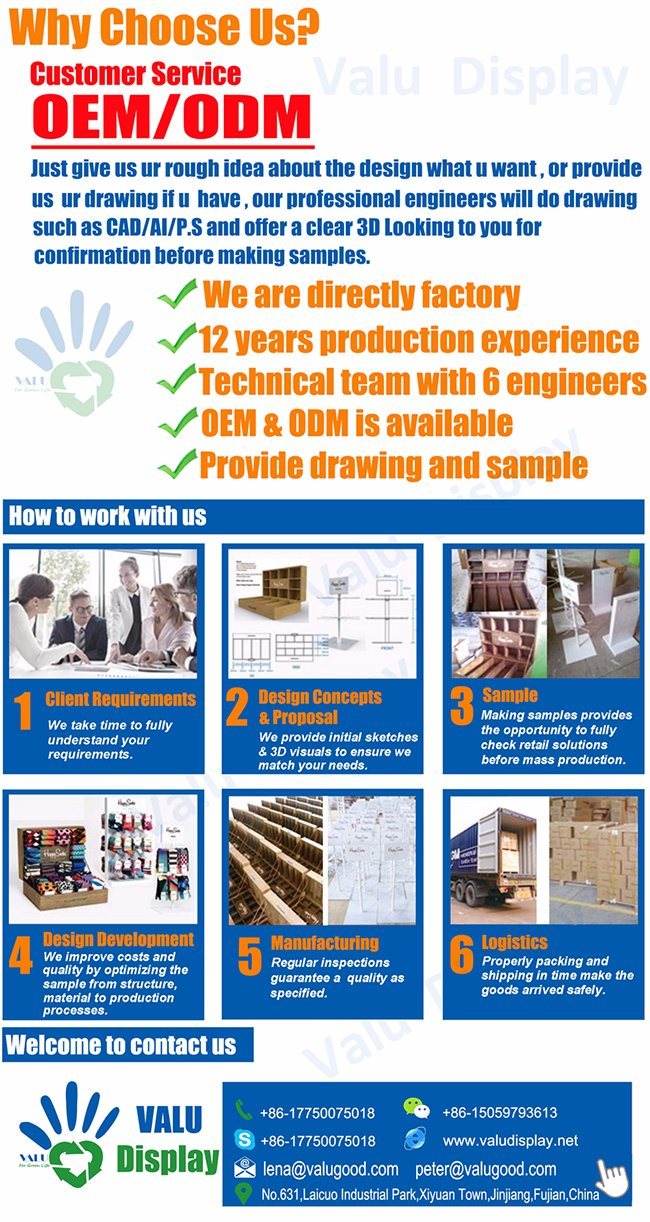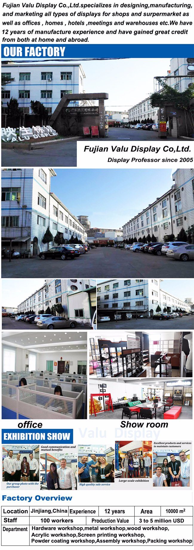 Co. van de Vertoning van Valu van Fujian, Ltd is één zeer ervaren en professionele fabrikant en exporteur om vele soorten vertoningen en furnitures te maken. Wij maken en leveren vier hoofdcategorieën, metaal, houten, acryl en LEIDENE signage producten. Soms, maken wij de vertoningen van pvc of van het glas volgens de speciale vraag van de klanten ook ontmoeten. Onze producten worden wijd gebruikt voor winkels en supermarkten, evenals bureaus, huizen, hotels, vergaderingen en pakhuizen enz.
