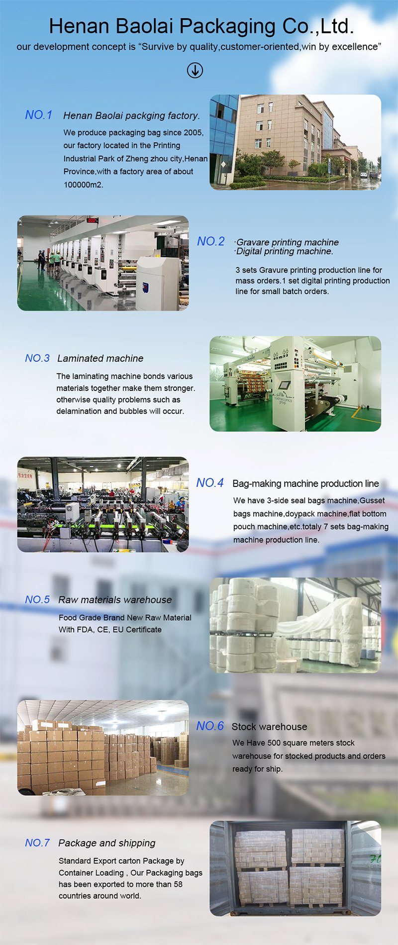Henan Baolai die Co., Ltd verpakken is een fabrikant op grote schaal van de verpakking van zakken. Wij zijn ernstig verantwoordelijk voor ons werk en voeren een professioneel beheerssysteem van verantwoordelijkheids contracterend systeem uit om ervoor te zorgen dat iedereen kan strikt eisen en verantwoordelijk voor het werk zijn. Wij hebben duidelijke beloningen en sancties voor het personeel, en er zal geen ongevallen elke maand zijn. Wij zullen de noodzakelijke beloningen aan de arbeiders, de managers en de technici geven. Al ons technisch personeel heeft meer dan tien jaar van het werkervaring, van plaat die, zak makend, en strikte eis ten aanzien van elk proces afdrukken lamineren maken zetten